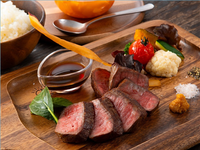 シェフが焼き上げた国産牛モモステーキは、食べた瞬間に赤身の旨味がひろがります。自家製のスープとライスがセットになった大満足の一品です。