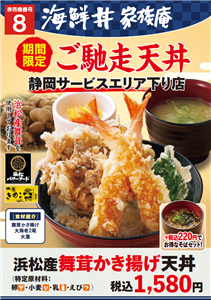 香り高い浜松産の無農薬舞茸を贅沢に使ったかき揚げに、ぷりぷりの大海老を二尾も乗せた豪華天丼!ボリューム満点、味わい満点の贅沢な丼です。