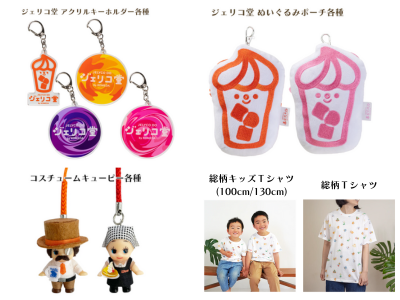 価格:(左上から)ジェリコ堂アクリルキーホルダー各種500円、ジェリコ堂ぬいぐるみポーチ各種2,500円、コスチュームキューピー(ストラップ)各種900円、総柄キッズTシャツ(100cm/130cm) 2,500円、総柄Tシャツ2,900円