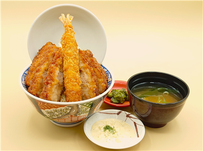 通常の約2倍のサイズのカツをジューシーに仕上げ、お子様から大人まで人気のエビフライを一本添えました。