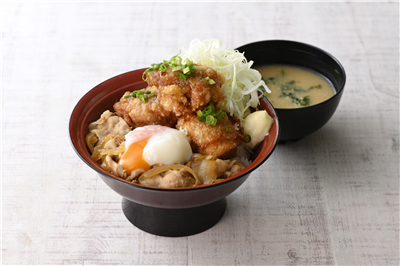 甘辛のタレが染みた豚肉と卵のコクは相性抜群!さらに、から揚げ3個乗ったボリューミーな一品です!