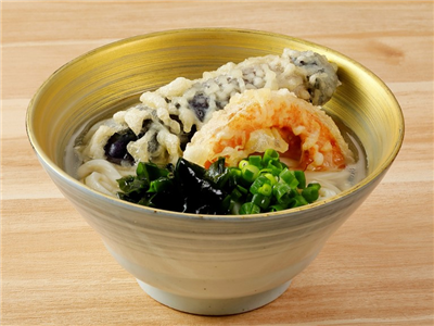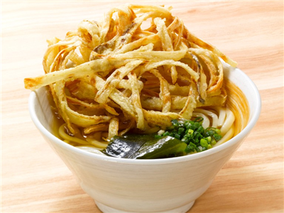 久原醤油の「あごだしつゆ」を使用しております。風味豊かで黄金色(こがねいろ)に仕上げた『うどん』で、ごぼうは薄くスライスしサクサクの食感が出るように天ぷらにしています。