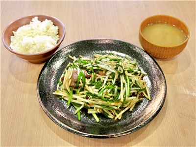 たっぷりの野菜と豚バラを特製ダレで絡めた一品。