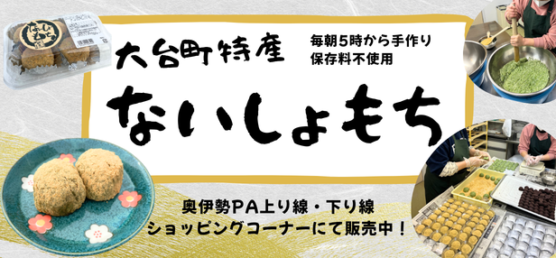 大台町特産の門外不出のお餅。もちもちで柔らかく、ひとくち頬張ればよもぎときな粉の香りがふわっと鼻に抜けて、お米、よもぎ、きな粉、あんこの甘さが絶妙なハーモニーを奏でます。名前の由来は、杵で餅つきをすると音がして餅をついていることが知れ渡り、おすそ分けをしなくてはいけないので、音のたたない棒でつつきながらこっそり作って内緒で食べたことから「ないしょもち」と呼ばれるようになりました。毎朝5時から『ふるさと耕房大台』で昔ながらの製法で心を込めて手作りしています。配送やネット販売などを行っていないため、まさに「門外不出」。ぜひお買い求めください!