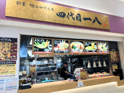 四代目一八は名古屋の食文化の一つである「きしめん」を創業の明治43年より百年以上に渡り守り受け継いでまいりました。 自慢の出汁は、化学調味料を一切使用せず、天然のムロアジをベースに特級たまり醤油と白醤油をブレンドし、素材を生かした独自の伝統製法で毎日仕込んでおり、決して飽きない味わいが特徴です。 きしめんは伝統の平打ちで、しっかりとしたコシと滑らかな食感を持ち、つゆとの相性が抜群です。お好みの天ぷらをトッピングして頂き、自分だけの麺をお楽しみください。 四代目一八8:00~21:00 フードコート