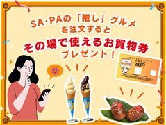 各エリアのフードコート・レストラン店舗で「推しグルメ」を注文すると、その場で200円分のお買物券をプレゼント!お買物券は当日から売店で利用できます。「食べて→使って」楽しめる、さぱフェスならではのおトク企画です。対象SA・PA:<東名高速道路>港北PA(上り)、EXPASA海老名(上下線)、中井PA(上下線)<西湘バイパス>西湘PA(上り)<小田原厚木道路>大磯PA(上り)、小田原PA(下り)<圏央道>厚木PA(内回り、外回り)お買物券利用可能店舗一覧:【ご利用の流れ】①飲食店舗で対象メニューを注文②200円お買物券をゲット③物販店舗でお買物券を使ってショッピング -