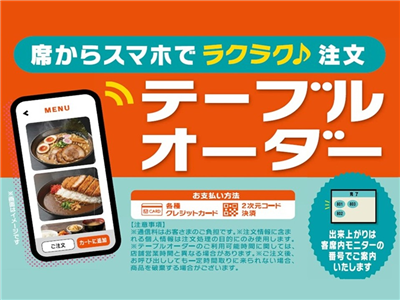 ・通信料は、お客さまのご負担です。・注文情報に含まれる個人情報は、注文処理の目的にのみ使用します。・テーブルオーダーのご利用可能時間に関しては、店舗営業時間と異なる場合があります。・ご注文後、お呼び出ししても一定時間取りに来られない場合、商品を破棄する場合がございます。