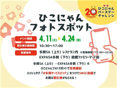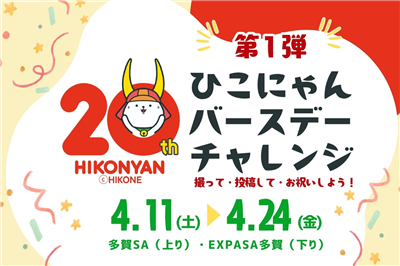 彦根市の魅力を全国に発信し、多くの人に愛されてきたひこにゃんが、2026年4月に生誕20周年を迎えます。この記念すべき節目をお祝いするため、多賀SA(上り)、EXPASA多賀(下り)では、撮って・投稿して・お祝いできる特別参加企画「ひこにゃんバースデーチャレンジ」を開催します!