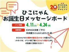 ひこにゃんへのお誕生日メッセージを自由に書いて貼れるコーナーです。お寄せいただいたメッセージは、キャンペーン終了後にひこにゃんへお届けします。≪設置場所≫・EXPASA多賀(下り)中央館コンシェルジュカウンター前