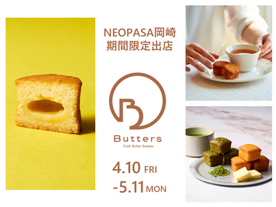 【イベント名】 クラフトバタースイーツブランド「Butters」【開 催 日 時】 2026年4月10日(金)~2026年5月11日(月)【営 業 時 間】 11時~18時【場 所】 E1A 新東名高速道路 NEOPASA岡崎(集約)1F 中央円形スペース※5月1日~5月6日の期間は、営業時間を10:00~19:00に延長しております。連休中のお土産やご自宅用のお買物に、ぜひご利用ください。 -