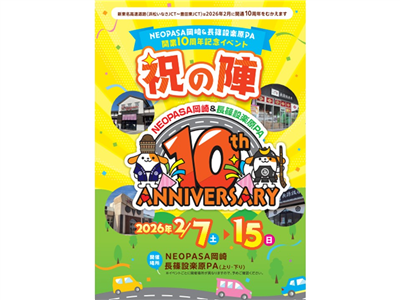 本イベントは2026年2月7日(土)~2月15日(日) の計9日間にわたり、NEOPASA岡崎(集約)・長篠設楽原PA(上下線)の各店舗にて、特別記念商品を提供するほか、NEOPASA岡崎(集約)・長篠設楽原PA(上下線)の連動イベントとして、イベント期間中に3か所すべてのSA・PAを訪れたお客さまへ、本イベント限定のノベルティをプレゼントします。